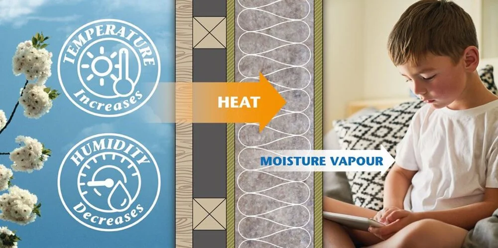 As air temperatures drop overnight, relative humidity increases. Moisture is gently absorbed into the wool fibre within the building envelope, releasing stored energy and helping stabilise indoor conditions.